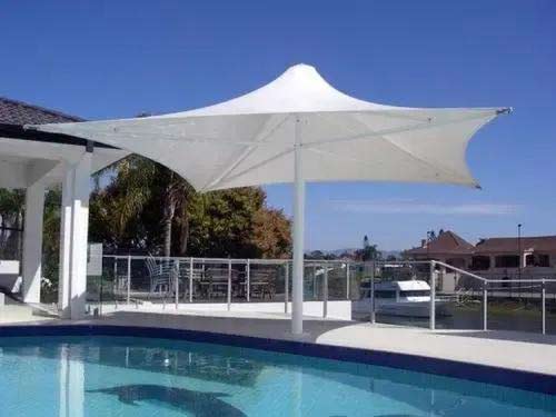 伞膜结构也是张拉膜结构的常见形式之一。该结构的特点是膜单元外围相对位置较低,多固定在刚性侧梁或柔性侧索上;膜单元中间有一个或多个高点,通常通过独立的柱子和飞行的柱子。
