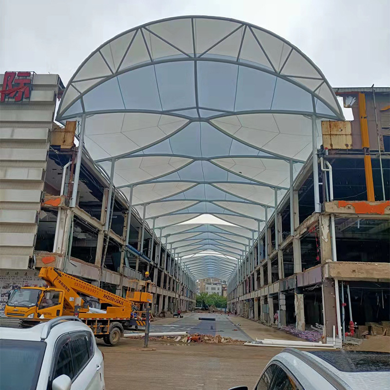 9、左右拉紧后,压条将最前面的膜布固定在前面横管上,整排全部压住。这是硬边做法。软便做法就是穿钢丝绳,用锚头拉紧。