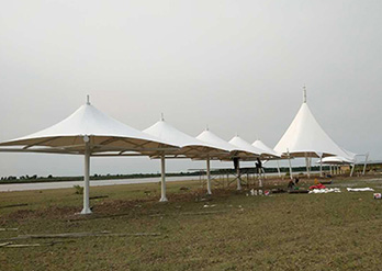 膜结构罩棚的跨度大是特点之一,在跨度大的建筑中需要对建筑的设计及膜材选用非常严格,由空气压力支撑膜面,或是利用柔性钢索或刚性骨架将膜面绷紧,从而形成具有一定刚度并能覆盖大跨度结构体系