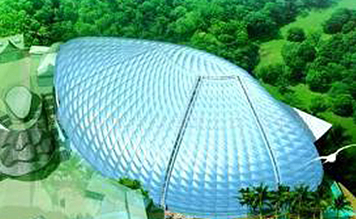 膜结构是由多种高强薄膜材料(PVC或Teflon)及加强构件(钢架、钢柱或钢索)通过一定方式使其内部产生一定的预张应力以形成某种空间形状,作为覆盖结构,并能承受一定的外荷载作用的一种空间结构形式。膜结构可分为充气膜结构和张拉膜结构两大类。充气膜结构是靠室内不断充气,使室内外产生一定压力差(一般在10㎜~30㎜水柱之间),室内外的压力差使屋盖膜布受到一定的向上的浮力,从而实现较大的跨度。张拉膜结构则通过柱及钢架支承或钢索张拉成型。