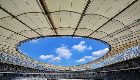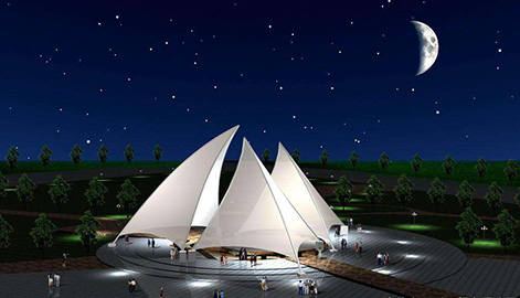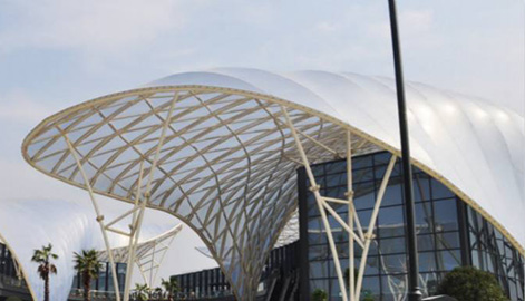 膜结构设计轻质:膜材料张力结构自重小的原因在于它依靠预应力形态而非材料来保持结构的稳定性。从而使其自重比传统建筑结构的小得多,但却具有良好的稳定性。建筑师可以利用其轻质大跨的特点设计和组织结构细部构件,将其轻盈和稳定的结构特性有机地统一起来。透光性:透光性是现代膜结构最被广泛认可的特性之一。膜材的透光性可以为建筑提供所需的亮度,这对于建筑节能十分重要。对于一些要求光照多且亮度高的商业建筑等尤为重要。通过自然采光与人工采光的综合利用,膜材透光性可为建筑设计提供更大的美学创作空间。夜晚,透光性将膜结构变成了光的雕塑。膜材透光性是由它的基层纤维、涂层及其颜色所决定的。标准膜材的光谱透射比在10%~20%之间,有的膜材的光谱透射比可以达到40%,而有的膜材则是不透光的。膜材的透光性及对光色的选择可以通过涂层的颜色或是面层颜色来调节。通过膜材和透光保温材料的适当组合,可以使含保温层的多层膜具有透光性。即使光谱透射只有几个百分点,膜屋面对于肉眼来说依然是发亮和透光的,具有轻型屋面的观感。柔性:张拉膜结构不是刚性的,其在风荷载或雪荷载的作用下会产生变形。膜结构通过变形来适应外荷载,在此过程中荷载作用方向上的膜面曲率半径会减小,直至能更有效抵抗该荷载。膜结构的柔性使其在任一荷载作用下均以最有利的形态承载。当然,结构的布置和形状要根据荷载情况来进行设计和调整。设计要确何膜面与其辅助结构协调工作,以避免力在膜面或辅助结构上集中而达结构破坏的临界值。